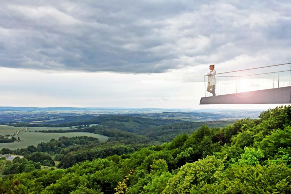 Ein sagenhafter Aussichtspunkt ist der Sonnenstein nahe Holungen allemal. Angekommen auf 486 Metern Höhe, eröffnet sich ein einzigartiges Panorama: Bei klarer Sicht kann man vom Harz über das Kyffhäuser- und das Ohmgebirge bis hin zur Goldenen Mark sehen. Malerische Sonnenuntergänge sind hier an vielen Abenden im Jahr garantiert. Seit 2017 steht hier die besondere Attraktion Skywalk. Die Konstruktion aus Stahl und Glas ragt 14 Meter weit über die Klippen hinaus. Der Steg verspricht Nervenkitzel bei atemberaubendem Blick in die Natur. Der Aussichtspunkt ist an mehrere Wanderrouten angebunden. Zum Rasten inmitten der besonderen Flora und Fauna lädt eine segelförmige Überdachung mit Sitzgruppe ein. Verschiedene Stelen informieren über weitere Sehenswürdigkeiten der Region. Von der höchsten Stelle des Plateaus erhebt sich das weithin sichtbare Friedenskreuz. Es wurde zu Ehren des Heimatdichters und Pfarrers Dr. Hermann Iseke errichtet, aus dessen Feder unter anderem das bekannte Eichsfeld-Lied stammt.