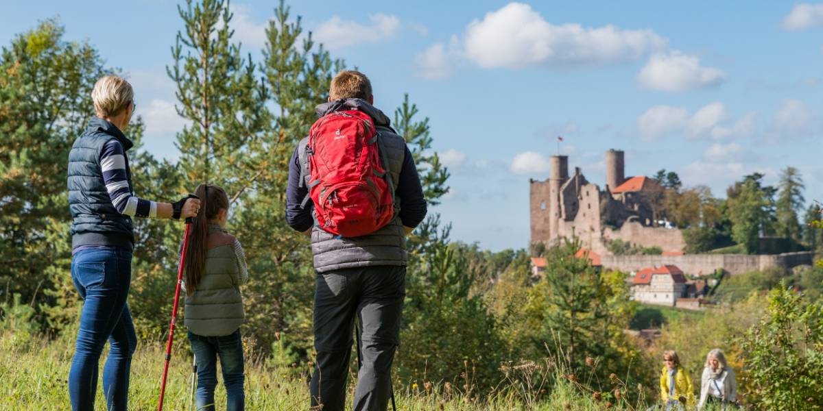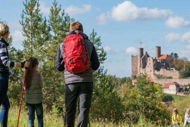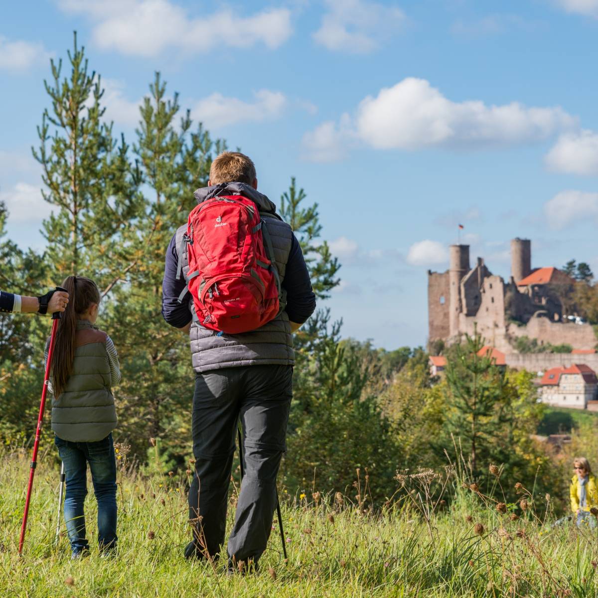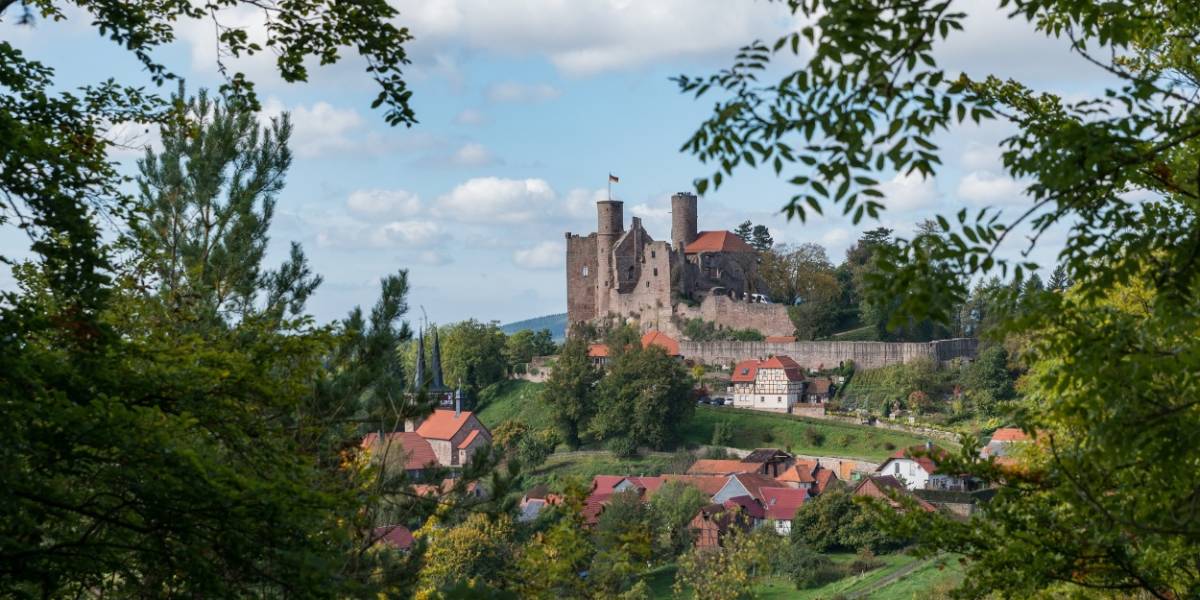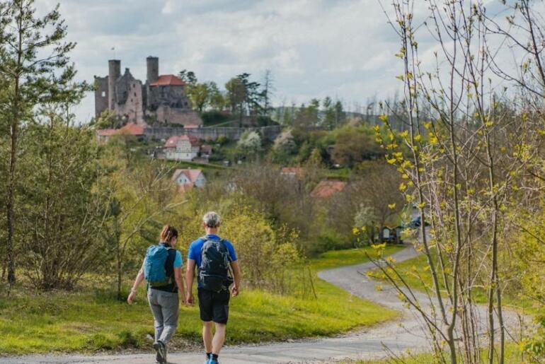 Ein kurzer Abzweig auf die Hansteinstraße führt Sie zum Zweiburgenblick. Zurück in Rimbach verläuft die Wanderung auf einem Abschnitt des Kolonnenwegs. Dieser ist Teil des TOP Wanderwegs am „Grünen Band“. Zuletzt umrunden Sie den bewaldeten Burgberg bis zu Ihrem Ausgangspunkt in Bornhagen.