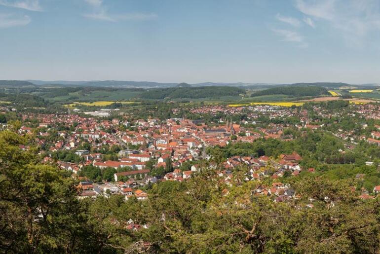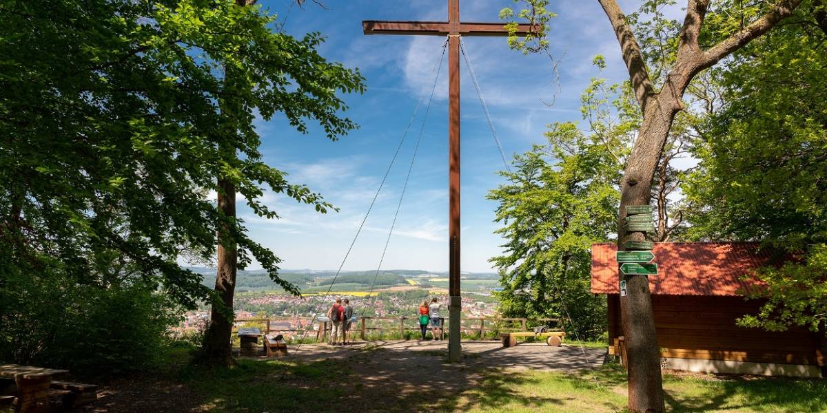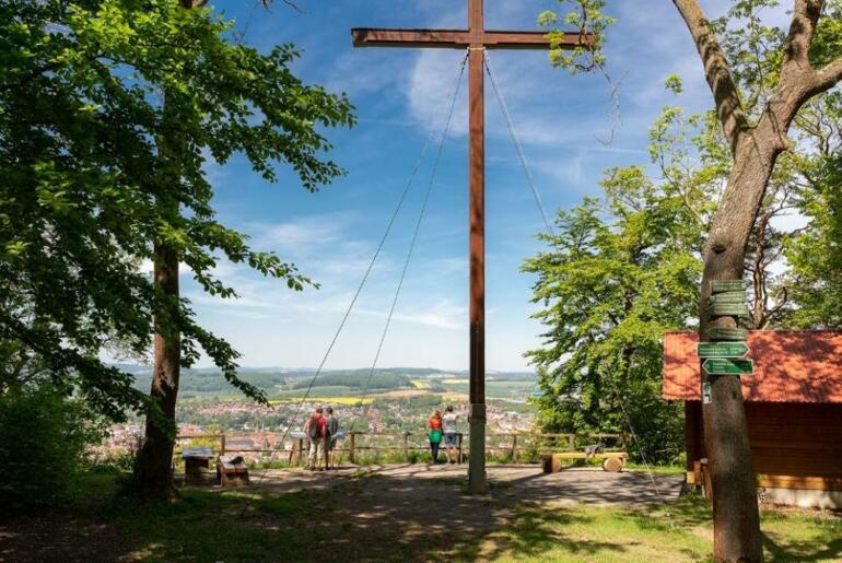 Über den Eselstieg wandern Sie stetig bis auf 440 Meter Höhe hinauf. Der schönste Aussichtspunkt auf dem Plateau des Düns befindet sich am 1948 errichteten Dünkreuz. Die im Volksmund als ,,Schöne Aussicht“ bezeichnete Stelle bietet einen wunderbaren Blick hinunter zur Stadt im Leinetal, zum Iberg mit der Elisabethhöhe und im Hintergrund zum kegelförmigen Rusteberg. Das etwa 13 Meter hohe Holzkreuz wurde nach dem II. Weltkrieg von Männern aus Heiligenstadt errichtet, die für ihre gesunde Heimkehr danken wollten.