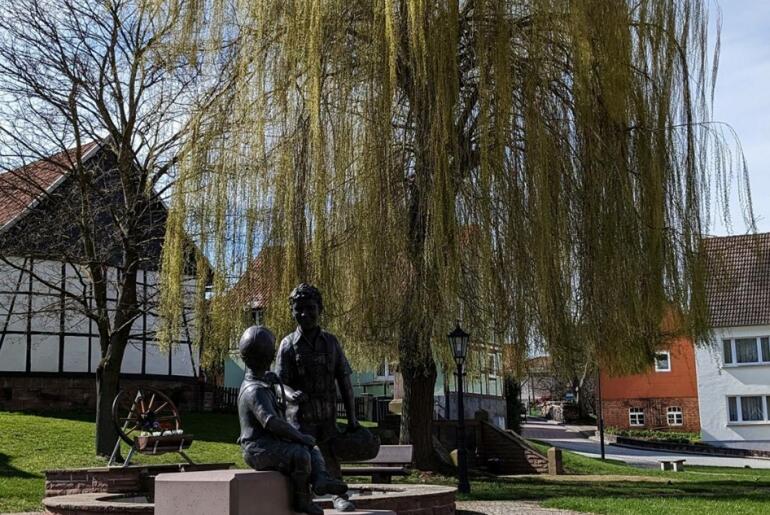 Ihre Wandertour beginnt am Kriegerdenkmal in Gerbershausen. In der Parkanlage des Ortes begegnen Sie den Heidelbeerjungs – der in Bronze gegossene Spitzname der Bewohner.