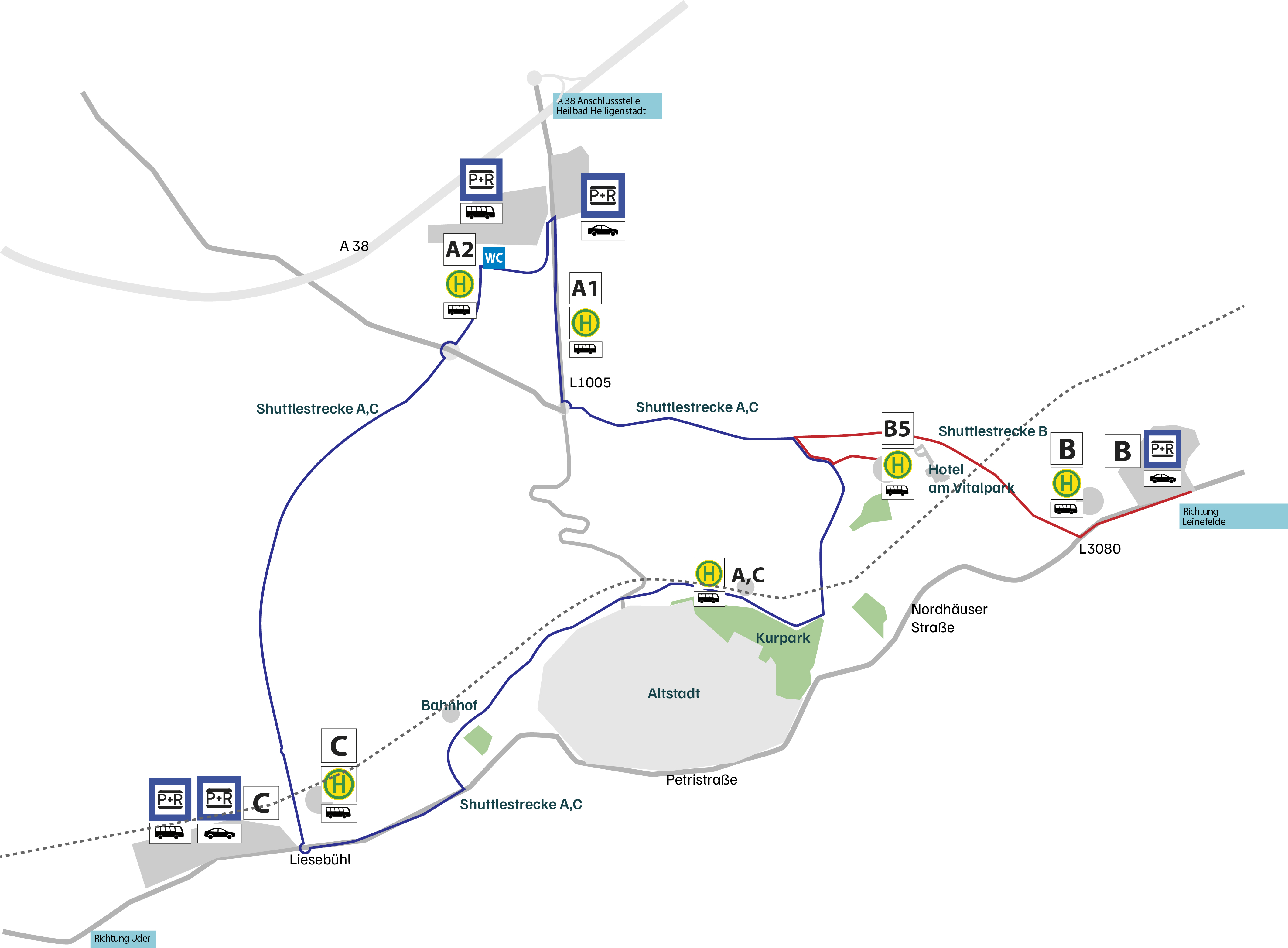 Es gibt drei verschiedene Park&Ride Parkplätze an den Stadträndern Heilbad Heiligenstadts. In regelmäßigen Turnussen bringen Sie Shuttle-Busse in die Innenstadt. Die Busse sind kostenfrei zu nutzen.